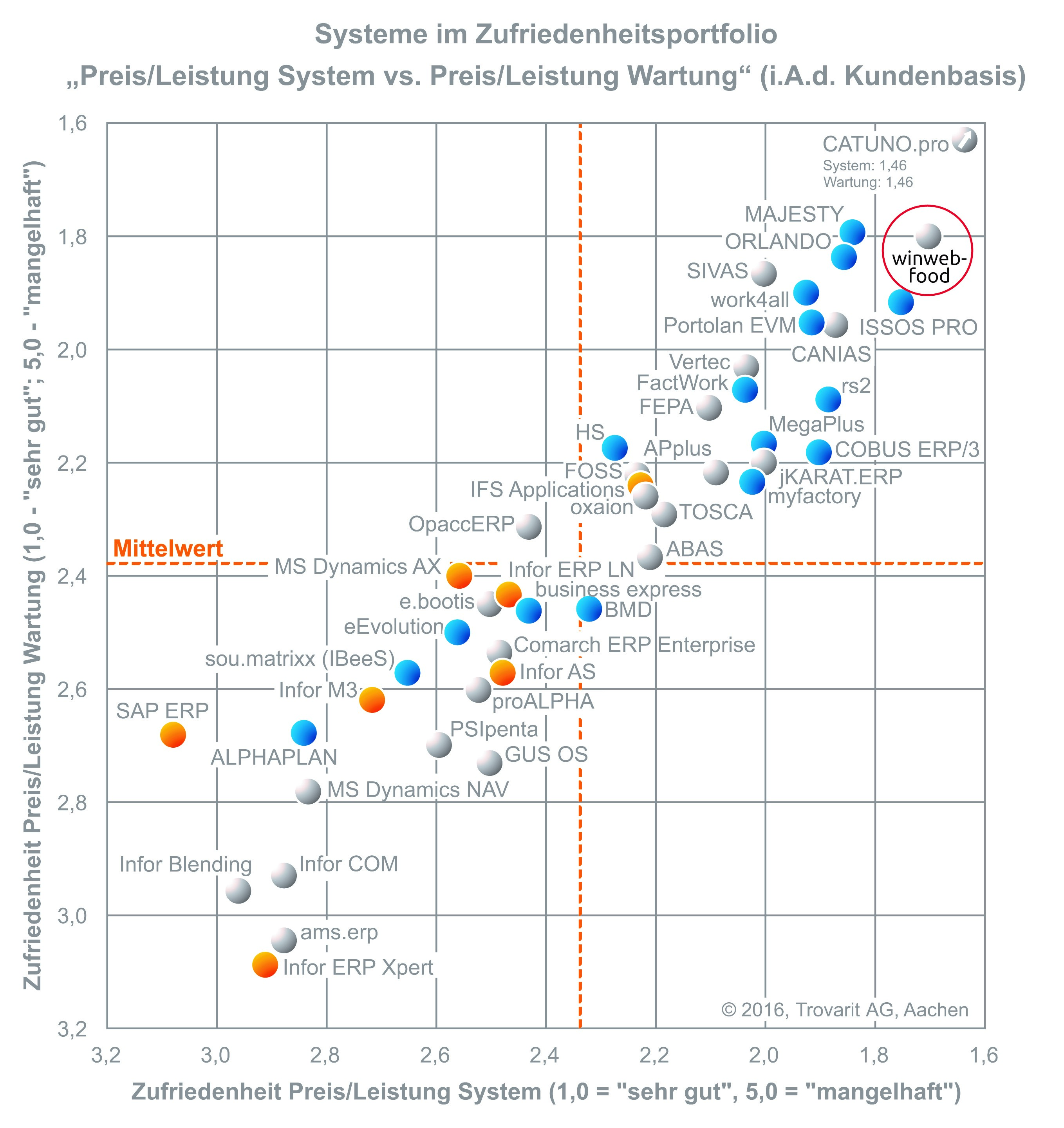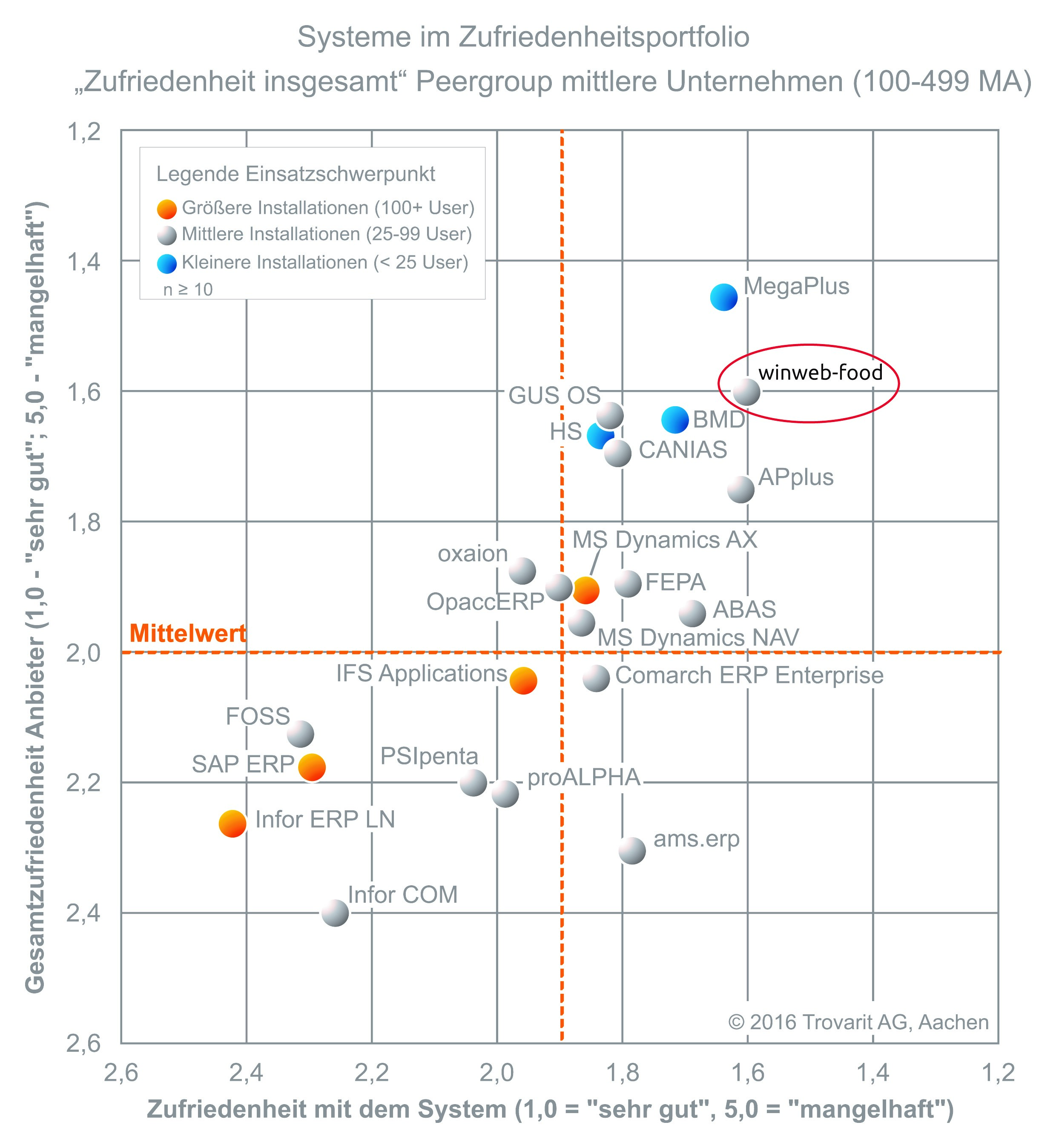 Zum achten Mal seit 2004 hat die Trovarit AG die Kundenzufriedenheit bei Unternehmenssoftware abgefragt. Bei der aktuellen Studie 2016/2017 wurden mit Unterstützung der Rheinisch-Westfälischen Technischen Hochschule Aachen auf der Basis einer Kundenbefragung 47 Softwareanbieter bewertet. Knapp 2600 teilnehmende Unternehmen beschrieben dabei ihre tatsächliche Zufriedenheit mit der eingesetzten ERP-Software in ihrer betrieblichen Praxis. winweb-food – die spezialisierte ERP-Software für Lebensmittelhersteller und Handelsbetriebe – erreichte bei der Studie die beste Bewertung unter allen getesteten Branchenlösungen.